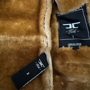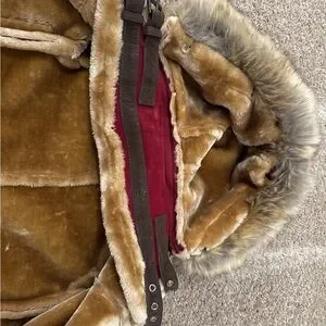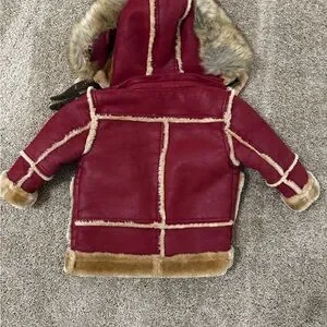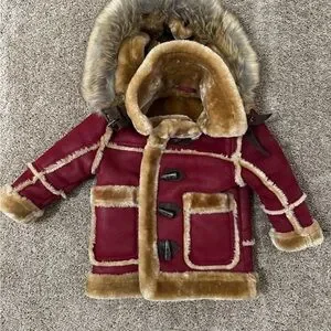 Your little one will stay warm, cozy, and stylish all season in this gorgeous shearling-style jacket. Made in a deep burgundy with plush tan faux shearling lining, it’s the perfect mix of fashion and function. The hood is detachable.