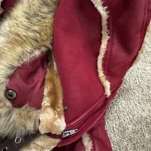 • Rich burgundy exterior with contrast tan faux shearling trim