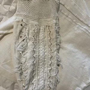 Elegant cream top with intricate lace details. Features fringed sleeves for added style. Perfect for layering.