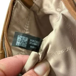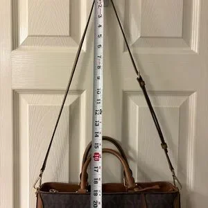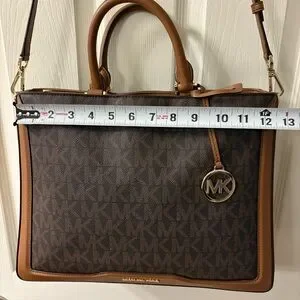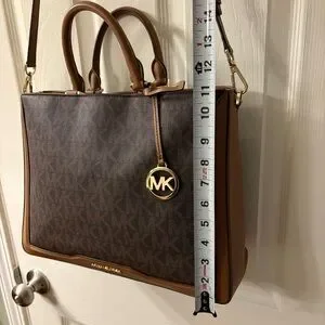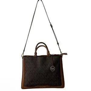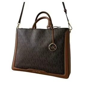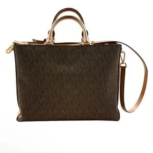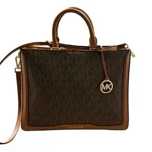 Crafted from logo-print coated canvas with leather trim.The hardware is gold-tone, including the prominent "MK" logo charm, a top zipper closure, interior pockets (zip and slip pockets), and an exterior slip pocket for easy access to essentials. The bag can be carried by its rolled top handles or worn as a shoulder bag or crossbody with its adjustable, removable strap. Beautiful Modern Classic Versatile