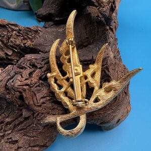 Vintage gold tone ribbon brooch, EUC. Adorned with faux pearls and rhinestones. 2” x 1 1/2”. Takes a magnet.