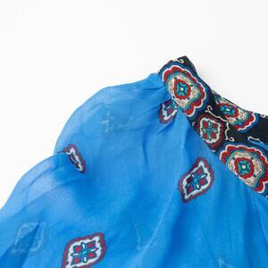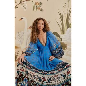 This vibrant blue maxi dress from FARM Rio features a bold, eclectic print that brings a lively and playful vibe to any occasion.