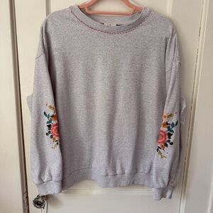 A cozy heather gray sweatshirt from World Market featuring vibrant floral embroidery on both sleeves and a relaxed fit. Perfect for layering or casual wear with a boho touch.