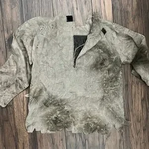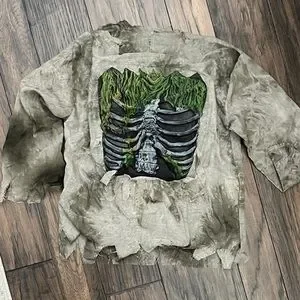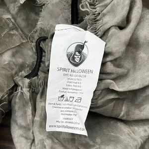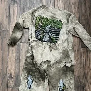 Ghoulish in the cutest way! 2-piece Zombie costume for your little brain-lover, featuring exposed skeleton on front chest and legs. The mouldy undead look is enhanced by the mottled grey-green color and ragged hems.