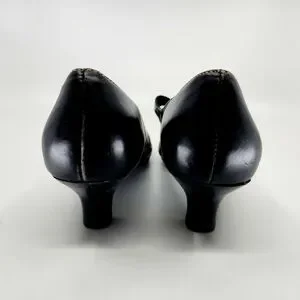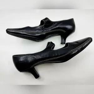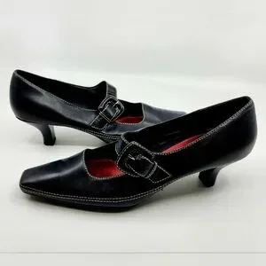 AEROSOLES Black Leather Mary Jane Buckle Heels Size 8 Topstitcing