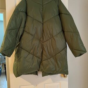 Chic olive puffer coat. Gold button details. Ideal for chilly days.