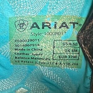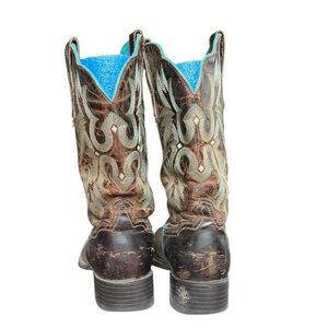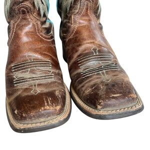 cowboy boots, Ariat boots, western style, brown leather boots, turquoise stitching, size 6.5B, rustic boots, durable boots, riding boots, work boots, cowgirl boots, distressed boots, authentic western wear, ranch style, outdoor footwear, leather western boots, distressed