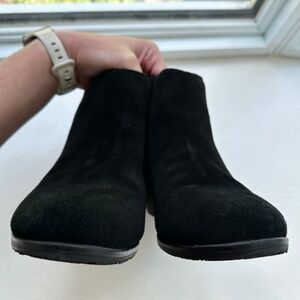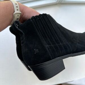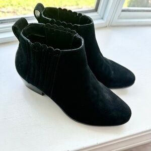 Jack Rogers waterproof suede ankle boots in black. Slip on with stretch pleated scalloped detailing. Minimal heel.