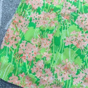 Super fun peach and Green floral Skirt from Lilly Pulitzer! It’s From the rare Vintage Liza Junior Line in the 1970’s. The only sign of wear is the stitching is pulled on the waist tie. But it has no other stains or holes that I can find and is even fully lined with large bucket pockets. 18” lying flat across waist before tying, 26” length.