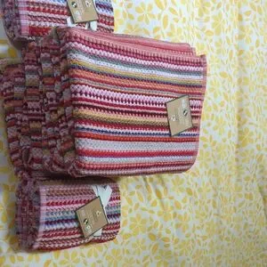 Vibrant striped towels in red, pink, and orange. Perfect for adding a pop of color to your bathroom. Thick and soft. 4 bath towels, 4 hand towels.