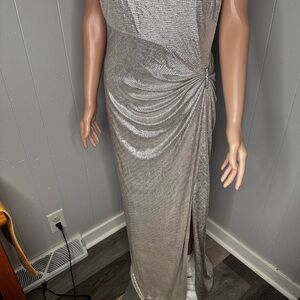 Shine in this champagne silver dress. Asymmetrical design with elegant draping. Ideal for evening events.