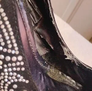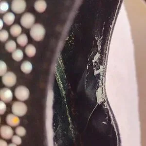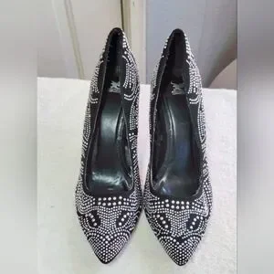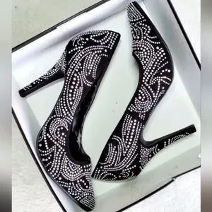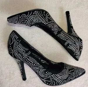 Stylish black heels with elegant rhinestone detailing. Perfect for any occasion. Super cute and in great shape! Only wear and tear visible is on the inside of the shoes (shown above) Exterior has not a single scuff or stain.
