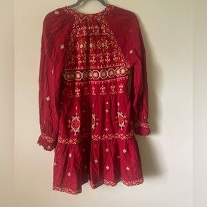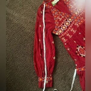 This Anthropologie dress is perfect for casual or resort wear, featuring a vibrant red color with cream accents. The tiered design and tie front add a playful touch, while the long bishop sleeves and v-neckline offer a relaxed yet stylish look.