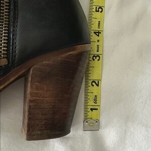 Chic black leather boots with Dual zippers and wooden heal. The size tag is gone - they are 7.5-8. Nice soft leather. Comfortable fit for sure! Heel is 3 inches.