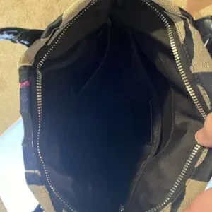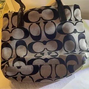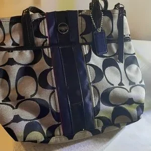 Stylish Coach tote with signature pattern. Black and cream design with Navy stripe and coach tag .Perfect for any occasion. Slight wear on inside of strap not visible - clean interior and exterior area.