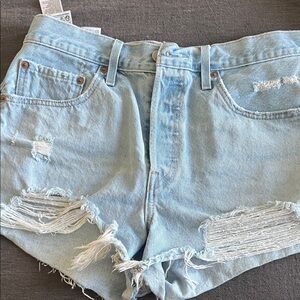 Stylish 501 Levi's jean shorts in light blue, pink, and white. Distressed design for a trendy look. Perfect for casual wear. Bundle for $100 or $25 each. 1 new pair with tags, the others worn once.