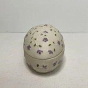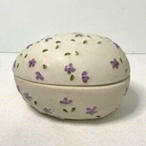 Vintage Hand Painted Ceramic Bisque? Easter Egg Candy Dish Trinket Box. Purple Flower. Very good condition. No chips or cracks. Minor signs of age.