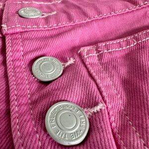Vibrant pink denim overalls. Adjustable straps. Front pocket detail. Button closures on sides. Free People, worn once.