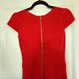 Red knit body con dress. Cap sleeve, full zip in the back. Mid thigh length. Very good condition. Coral color, leans more red than orange.