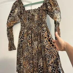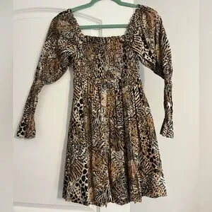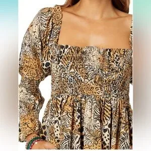 100% cotton Beyonca Dress in Black/Tan animal print. Features a square neckline and smocked bodice, pockets, and smocked detail on sleeves. Swing skirt is forgiving through hips/thighs. Like new - Worn once, no signs of wear.
