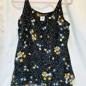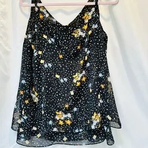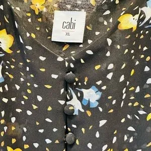 Two layers of printed chiffon in leafy, floral confetti print. Warm blue and gold tones cover the black background. Double layered V-Neck, covered buttons and unique 2 layer hem.