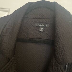 Chic black leather jacket with a modern design. Features zippered pockets and a stylish collar. Perfect for layering.