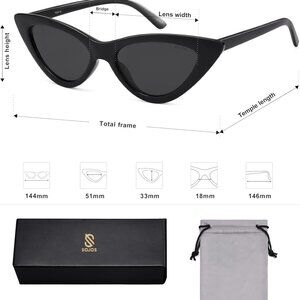 Product details Origin Made in the USA or Imported About this item UV400 lenses block 99.9% of UVA/UVB rays to protect your eyes from sun damage Stylish cat eye frame complements various face shapes and features Durable plastic frame with metal hinges for long-lasting wear Lens width 51mm; lens height 33mm; temple length 146mm; bridge width 18mm Pouch, cloth, and box included for easy storage and gift giving See more About this item