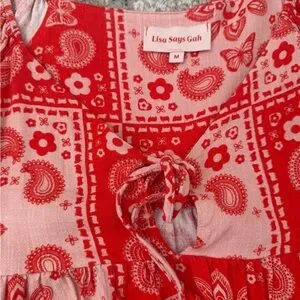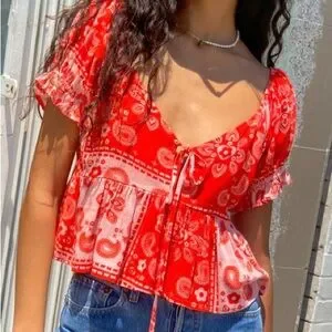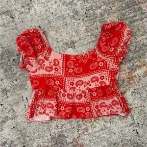 Red crop top with tie front and exaggerated sleeves. Bandana print. So cute and only worn a few times. No flaws.