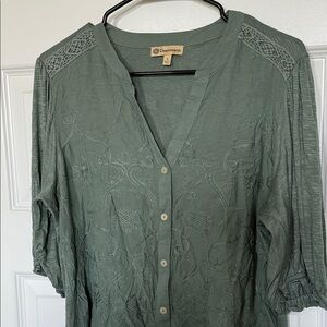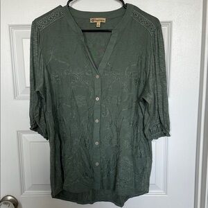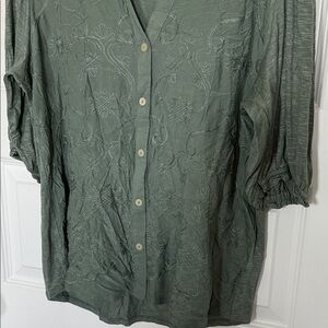 Chic green blouse with delicate embroidery. Features a button-up front and V-neckline. Ideal for versatile styling. Sz large PTP 21 inches
