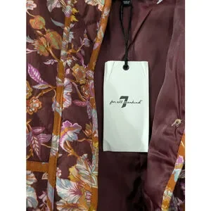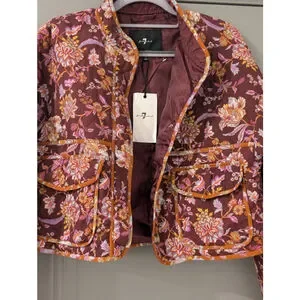"This is a Women's 7 For All Mankind quilted puffer jacket in size S. It features a burgundy base with a vibrant floral pattern in orange, pink, purple, and light blue. The jacket has a stand collar, two front flap pockets, and is trimmed with orange piping. It is made of 100% cotton shell and trim, with 100% polyester lining and fill. The jacket is new with tags and was made in China."