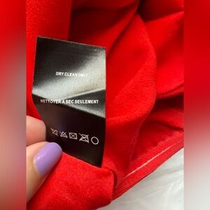 Adelyn Rae Red Rozina Woven Strapless Bow Top. Stylish, strapless red blouse featuring a large, structured bow detail across the chest. The design has a fitted bodice that flares out slightly at the hem, giving it a peplum silhouette. Hidden zipper up the back. Size Large.