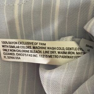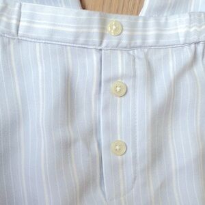 This cozy relaxed fit rayon pajama set features a top with turned cuffs, a chest pocket and a longer back. The pants feature an elastic waist, decorative buttons at the false fly and pockets. The color is a hydrangea blue and white stripe. Top length is 24” from shoulder in front and 30” from center back. Pit to pit is 22”. Pant inseam is 28”, rise is 12” and elastic waist is 34”.