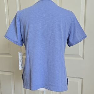 Elegant short sleeve tee with embroidered butterfly and flower design. Also, glittering rhinestones to add sparkle to the soft iris shade. Size Petite Small