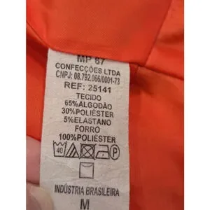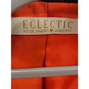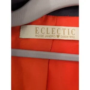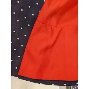 "This women's Eclectic blazer features a dark blue fabric with a white polka dot pattern and a vibrant orange lining. It has notched lapels, long sleeves, and a single-button closure. The back includes pleated details near the hem, with a small flap resembling a pocket. The shell is composed of 65% cotton, 30% polyester, and 5% elastane, while the lining is 100% polyester.
