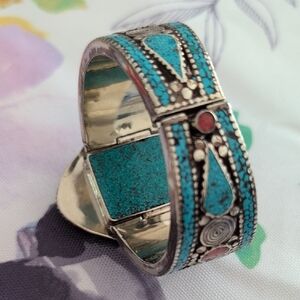 Turquoise and Coral Stone Tibetan Silver Bracelet