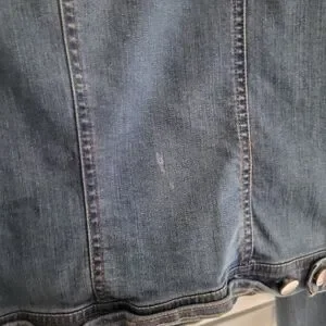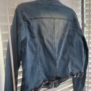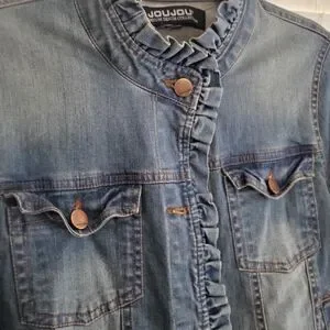 Stylish denim jacket featuring a chic ruffle trim. Perfect for adding a touch of elegance to your casual outfits.