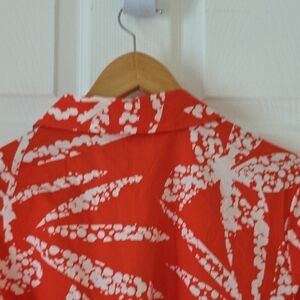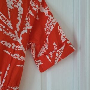 Elegant redish orange midi dress with white patterns. Features short sleeves and a belted waist. Perfect for versatile styling.