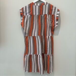 Features: Cotton and silk blend, tiered skirt, short sleeve / sleeveless, mini short length, 3-button front, orange / rust vertical stripes