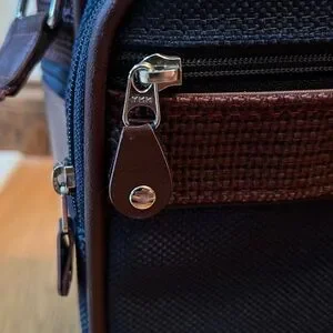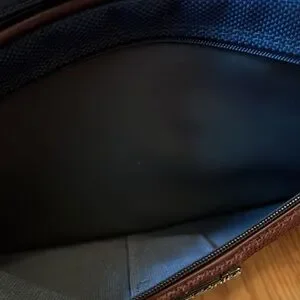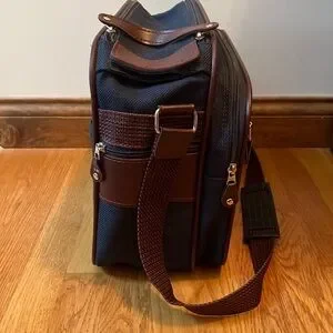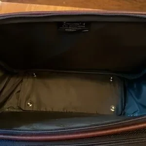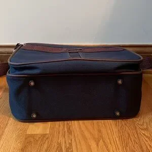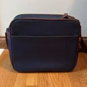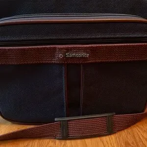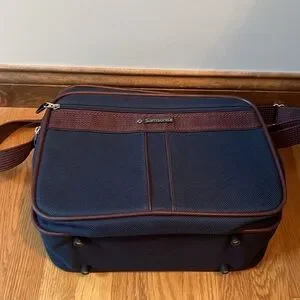 Vintage? Samsonite Silhouette 4 carryon travel bag. Navy blue tweed with brownish red shoulder strap. Zip top closure on main compartment with two front zippered compartments. Back pocket and two end zip pockets. Great preowned condition. Very clean inside and out. Any Questions? Leave a comment below!