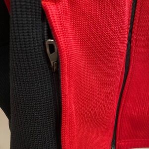 Stylish red and black sweater. Features zip-up design. Ideal for comfort and fashion.