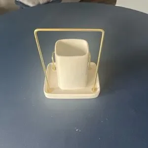 Elegant white ceramic holder with gold metal accents. Perfect for organizing bath essentials.