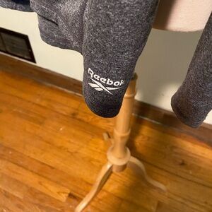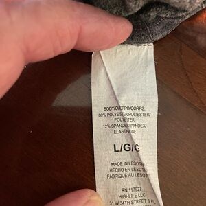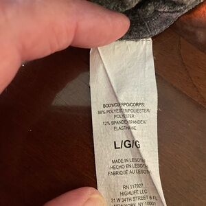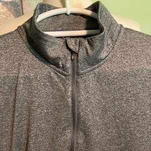 Has quarter zip neck opening. Princess seams on sides for a firm fit. Long sleeve. Size L. Color is a grey/blue tone.