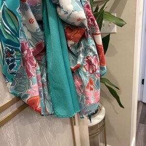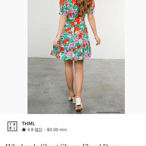Bright floral mini dress with short sleeves. Features a tie waist for a flattering fit. Perfect for casual outings.