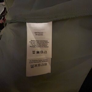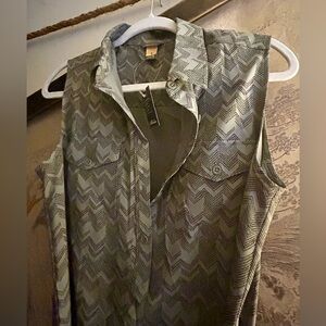 Color is Sprig which is a gray green tint with chevron print. Front button flap chest Pockets, buttons to front that you can leave open or any of the 5 buttons. Shirt collar. Has fabric tie best to adjust to desired waist style. Easy for travel, casual activities or work attire. Classic wardrobe staple