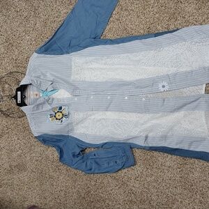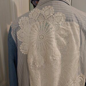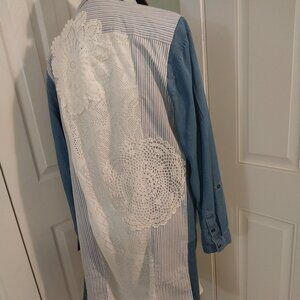 3647 Size 2X Upcycled Red Camel Lace Trimmed Tunic. Pit to pit 25" length 36" sleeve 24".