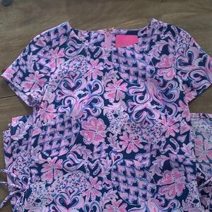 Vibrant pink and blue patterned Lilly Pulitzer Romper Size 0, with short sleeves and side ties. Perfect for a stylish look.