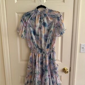 Elegant mini dress with watercolor pattern. Features ruffled sleeves and smocked waist. Perfect for any occasion.
