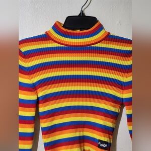 Brighten your style with this colorful striped crop top Minga London. Featuring bold red, yellow, and blue stripes, it's perfect for making a statement.