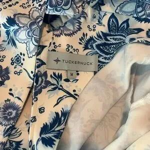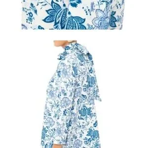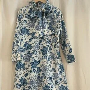 EUC size medium! Elegant dress with blue floral design. Features a bow at back of the neck making this gorgeous dress perfect for cocktail hour or a wedding. Smoke free home.