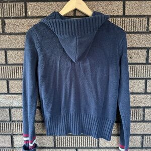 This Arizona Jean Co cropped cardigan hoodie is the perfect Y2K throwback piece. Navy knit with oversized buttons, ribbed hem, and sporty stripe sleeves. Cropped fit looks great with low-rise jeans or layered tanks.